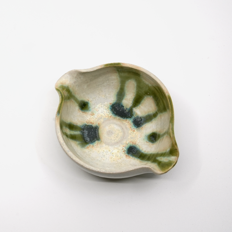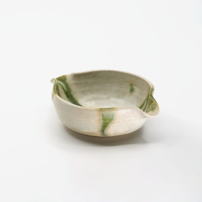 En liten skål i glasyr Mizu – grönvit med mörkare stråk, som vatten i rörelse.
