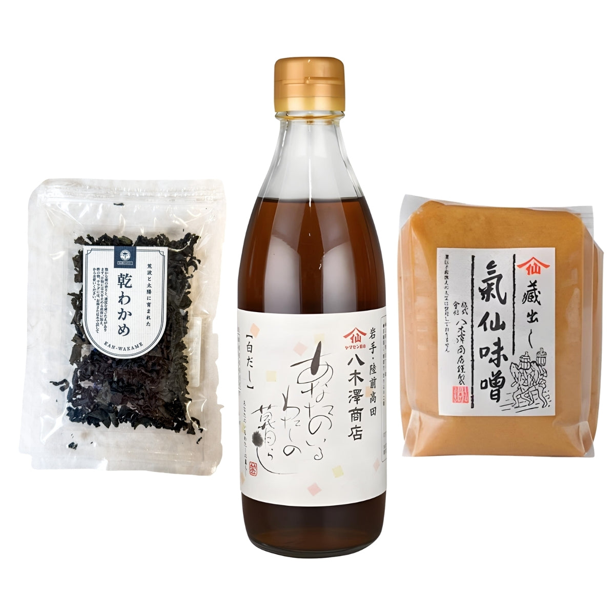 Koncentrerad klassisk dashi och vita rismiso från Yagisawa och den bästa wakamen jag någonsin ätit, producerad av Kitasanriku.