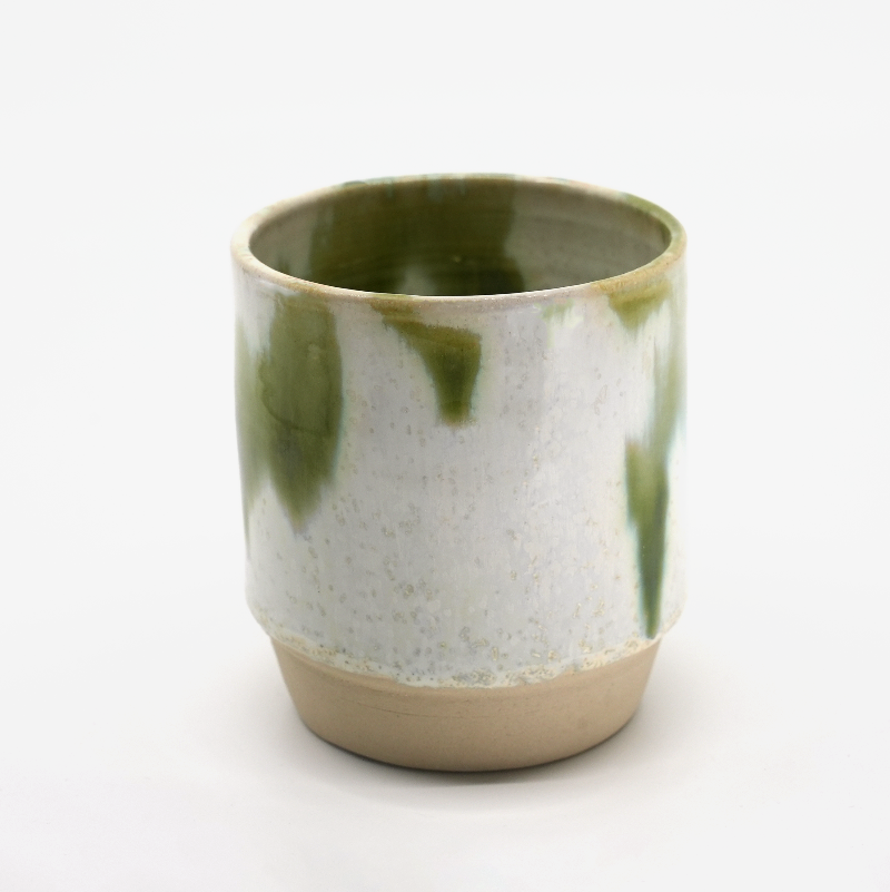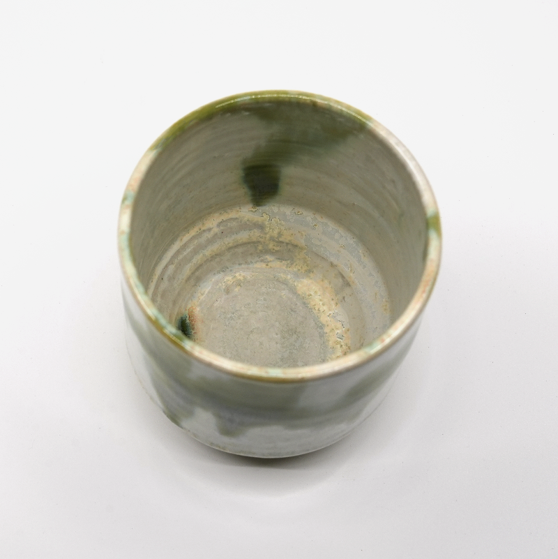 En mugg i glasyr Mizu – djup grönvit med mörkare stråk, som skuggor i rörelse. Den rena formen balanserar mellan kontrast och stillhet, tänk för stunder där enkelhet betyder mer än perfektion.