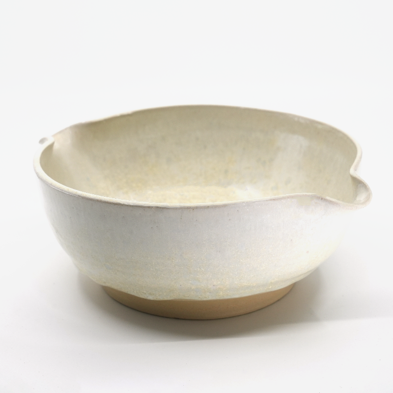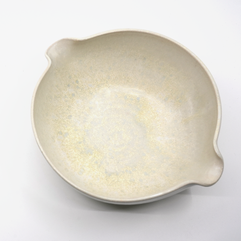 En stor skål i glasyr Haku – ljus, nästan vit med gyllene skiftningar som fångar det första morgonljuset.
