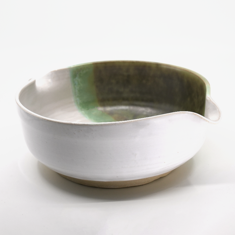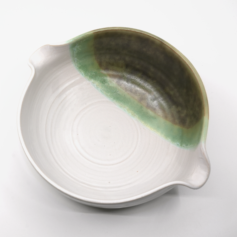 En stor skål i glasyr Tsuki – mjukt grönt, brunt och vitt som när himlen möter marken i en disig höstgryning.