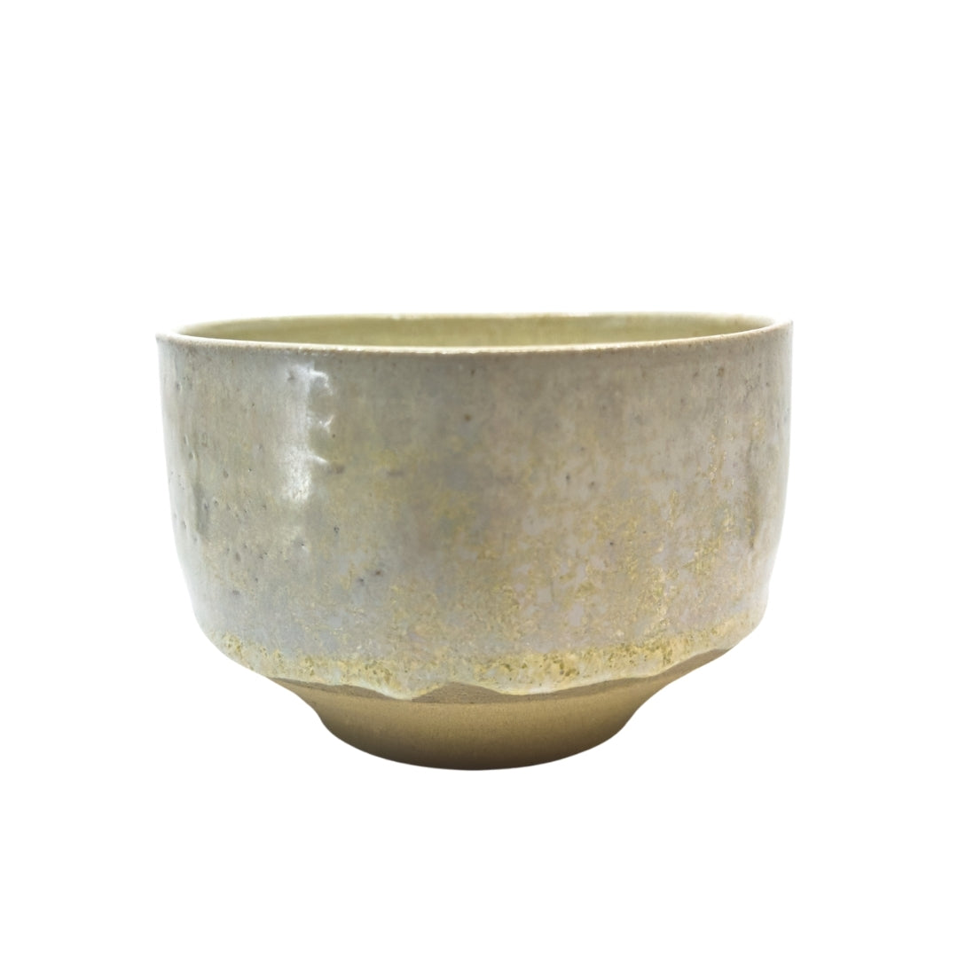 En matchaskål i glasyr Haku – ljus, nästan vit med gyllene skiftningar som fångar morgonljusets stilla klarhet. Formen är avskalad, med tyngd och balans som inbjuder till lugna ritualer i vardagen.