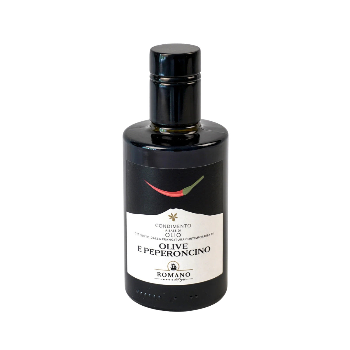 Frantoio Romano Vincenzo är en siciliansk producent i Bronteområdet vid Etnas fot – ett landskap som ger olivoljan sin karaktäristiska djupa fruktighet. Familjen pressar sina oliver varsamt och infuserar med lokalt odlad chili.