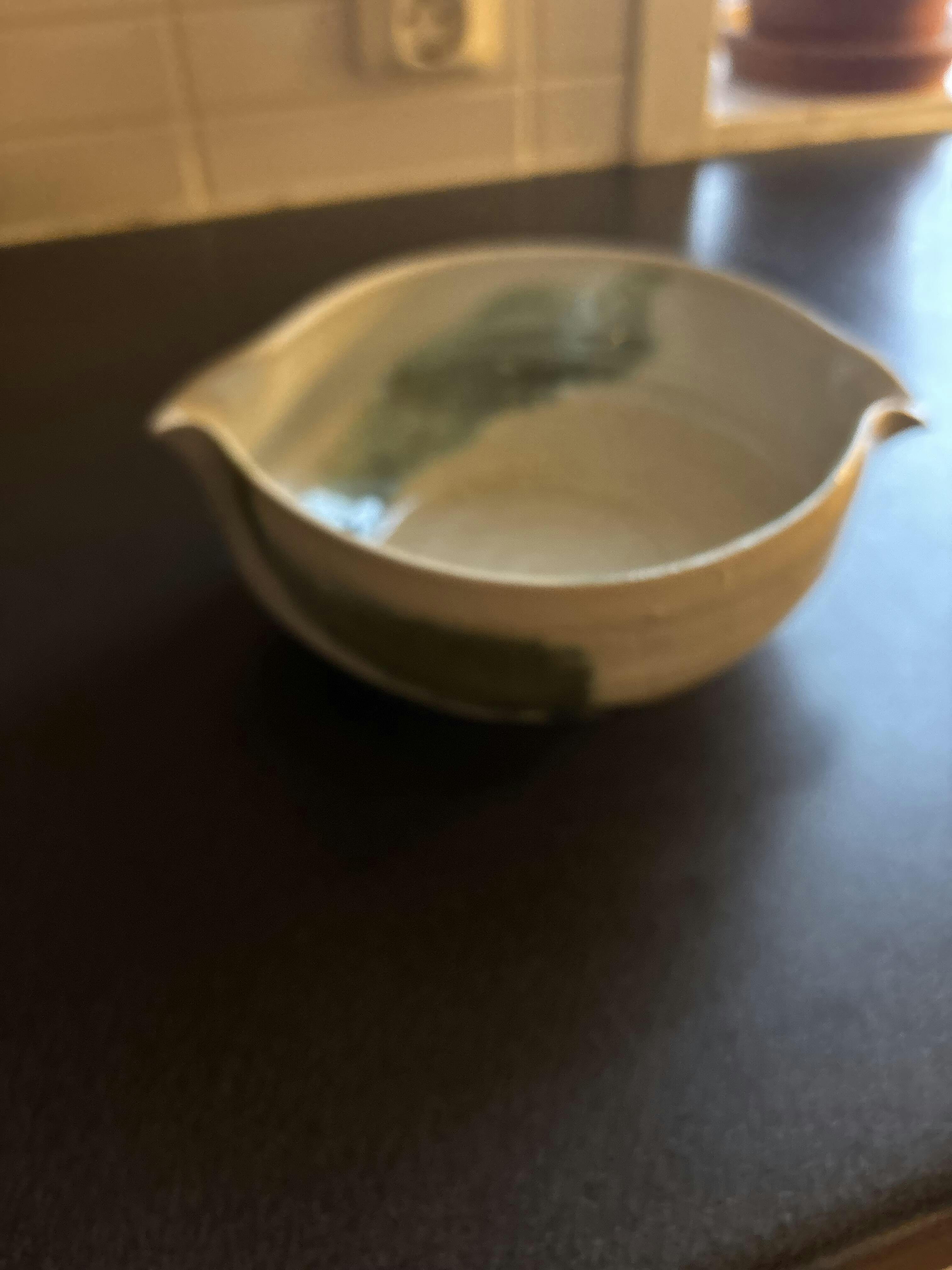En stor skål i glasyr Tsuki – mjukt grönt, brunt och vitt som när himlen möter marken i en disig höstgryning.